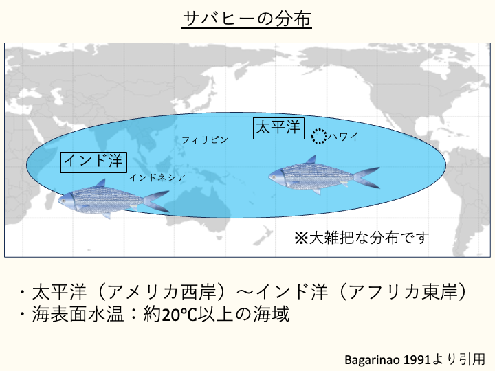 サバヒーの分布は、西はインド洋のアフリカ東岸、東は太平洋のアメリカ西岸まで、南北方向には海表面水温が≧20℃付近の海域までとされています[4]。このように、分布はかなり広い一方で、主にサバヒーを利用している国や地域は、フィリピン、インドネシアの一部(ジャワ島中西部やスラウェシ島)、台湾、ハワイ島などポリネシアの島々などに限られています[2]。