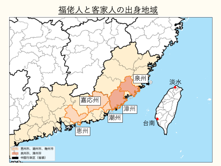 アヘン戦争後の天津条約によって、台南・淡水が開港すると、台湾はお茶の産地として注目されました。というのも、アヘン戦争は、お茶を高額で購入していたことによる貿易赤字が原因の一つとして起きた戦争です(『お茶の世界の散歩道: お茶には愛される理由がある』森竹敬浩 2009など)。清の支配の及んでいない地域でのお茶の栽培は、お茶の価格を下げたいヨーロッパ人にとっては、切実な問題でした。イギリス人貿易商のジョン・ダドは、福建南部から良質な茶苗を調達し、台湾の茶農家の栽培を推し進め、優良な茶葉を選び高級茶として輸出することに成功しました。1869年、フォルモサ・ティーとしてニューヨークに輸出され、その後世界50数カ国に輸出されるようになりました。オリエンタル・ビューティーと称された東方美人茶が生まれたのもこの時期です。まあ、その後お茶の産地が東南アジアや南アジア(インド)に移っていった(ヨーロッパに近いところで作った方が安い)ために、売れなくなる時期もあるのですが、台湾のお茶産業はヨーロッパ人によって発展したと言って間違いはないかと思います。台湾茶の輸出は今の台北周辺で始まったことが、台湾の中心地が台南から北へ移動した理由だという話をどこかで読んだのですが、どこで読んだのかは忘れました。 ↩︎ - 本省人のうち、福佬人と客家人の移住元について(脚注図2、3参照)[4]
