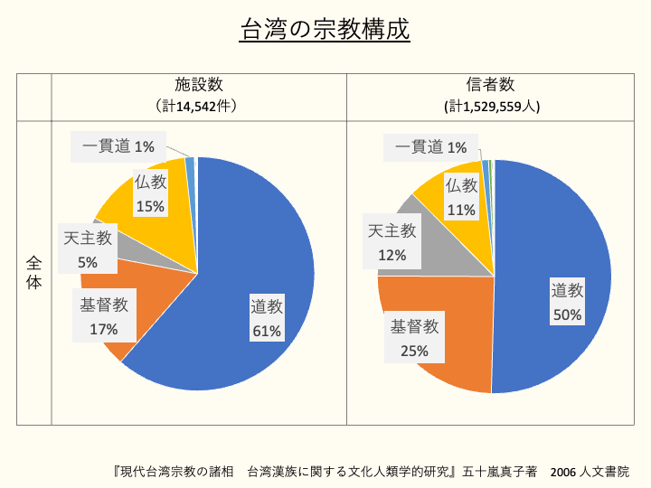 台湾で最も主要な宗教は道教です。本省人が8割以上にもなる台湾では、福建・広東の漢族によってもたらされた宗教が民間宗教の大部分を占めています[3]。日本統治時代には、道教は抑圧され、仏教寺院が多く建てられたものの、道徳教育のために道教の書物が使われたこともあり、今でも統計上の数値で半分近くを占めています[3]。