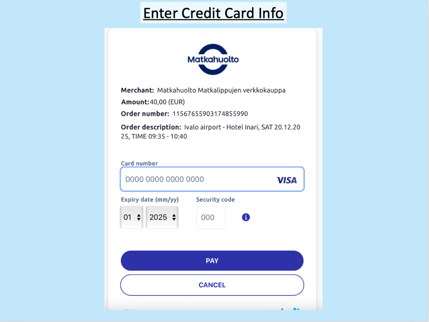 Enter your credit card number, expiration date, and the 3-digit security code, then click “PAY.”