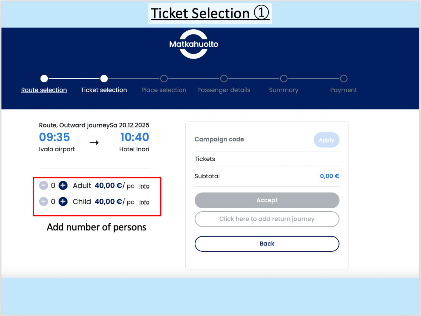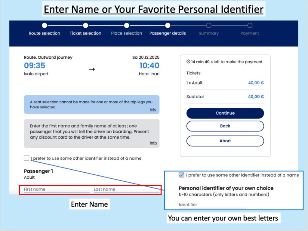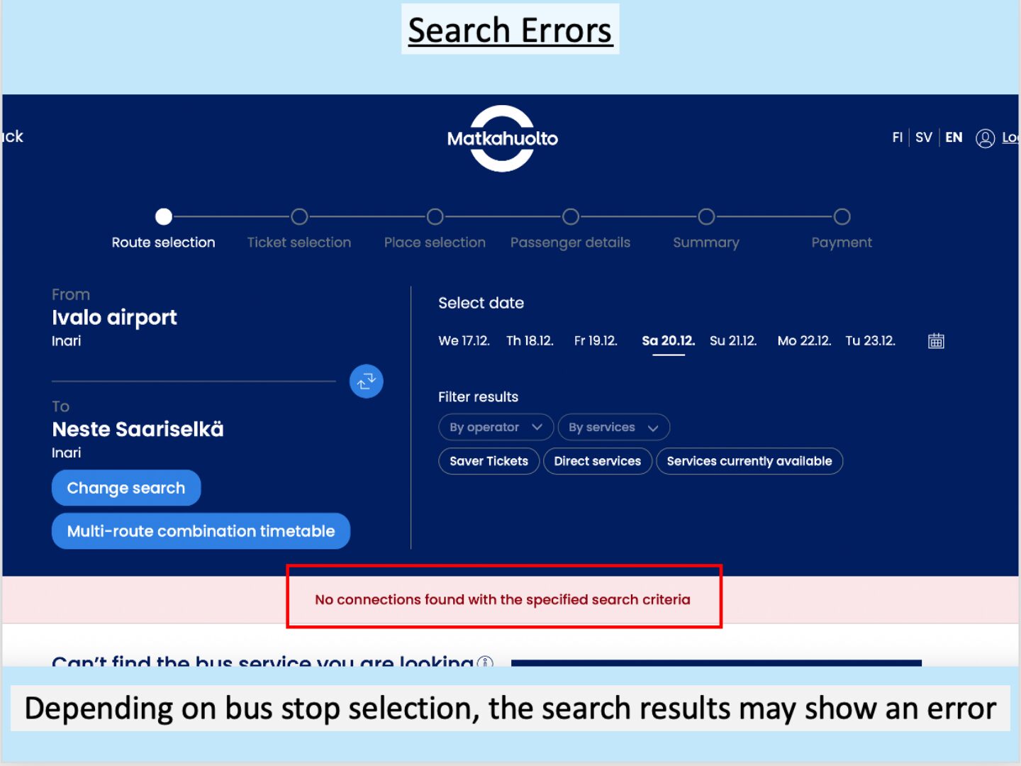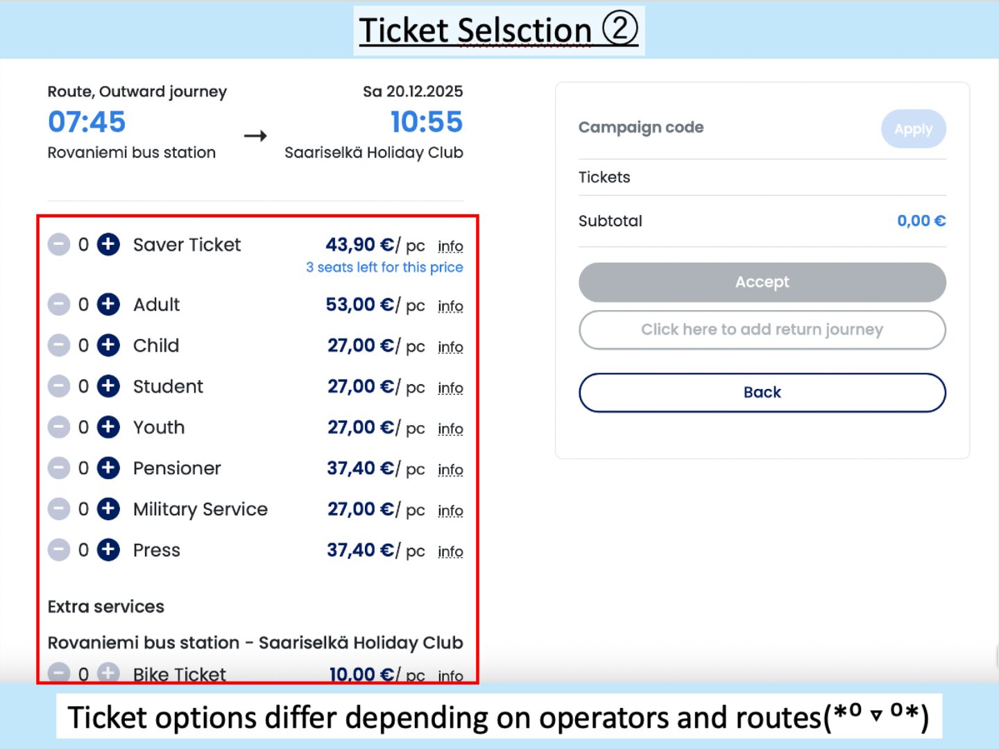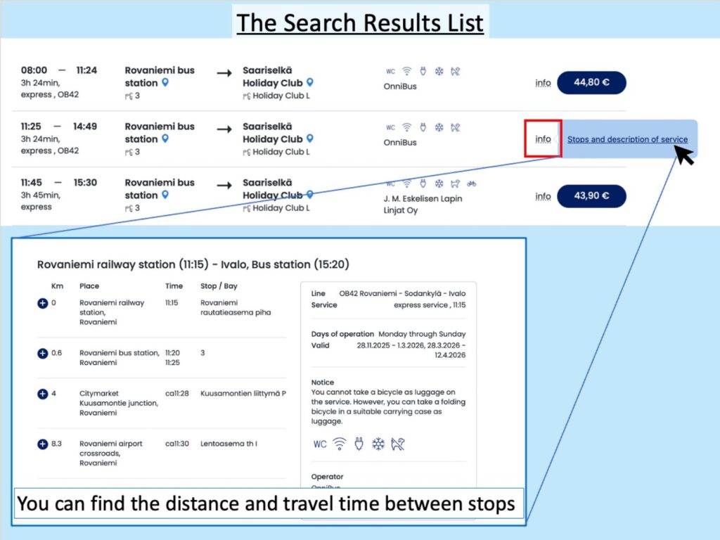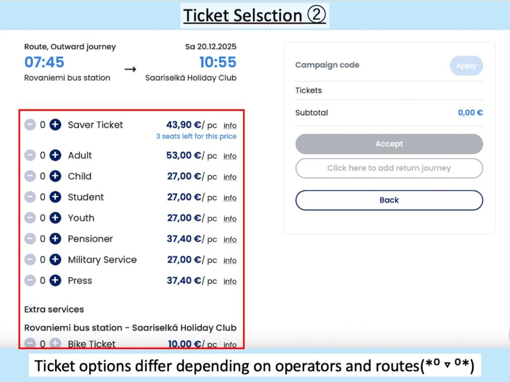 (Example: A search from Rovaniemi Bus Station → Saariselkä Holiday Club showed many more ticket options. It is recommended to explore various options during the planning stage, as ticket prices vary significantly by route.)