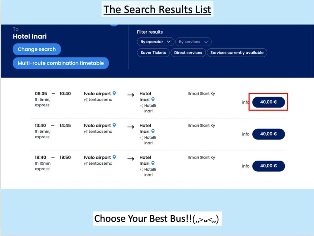 Choose the time, bus company (e.g., OnniBus/Eskelisen Lapin Linjat), and price that suits you, then click the price button.