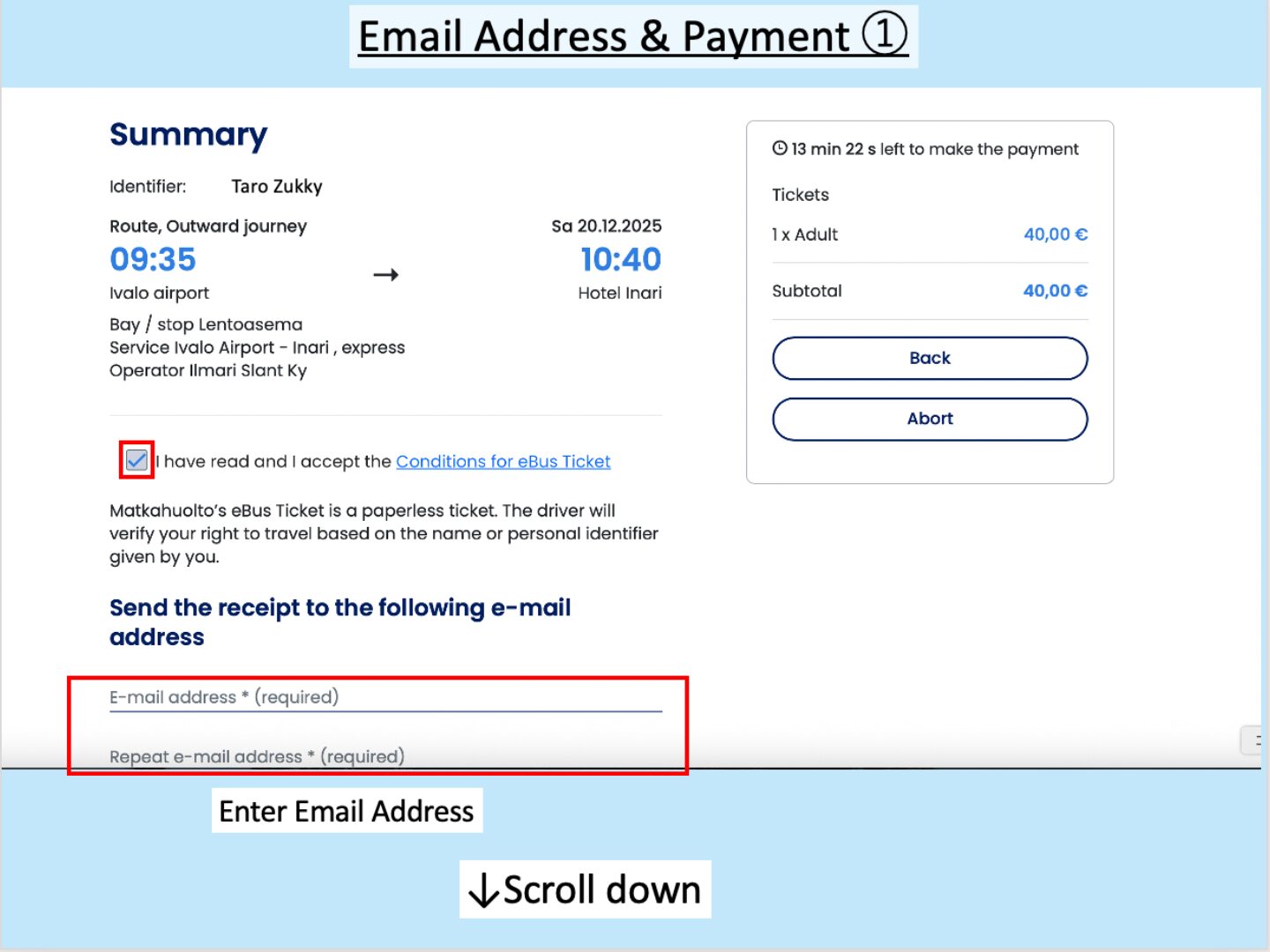 First, read the eBus Ticket Terms and Conditions and check the box that says “I have read and I accept the conditions for eBus Ticket.”