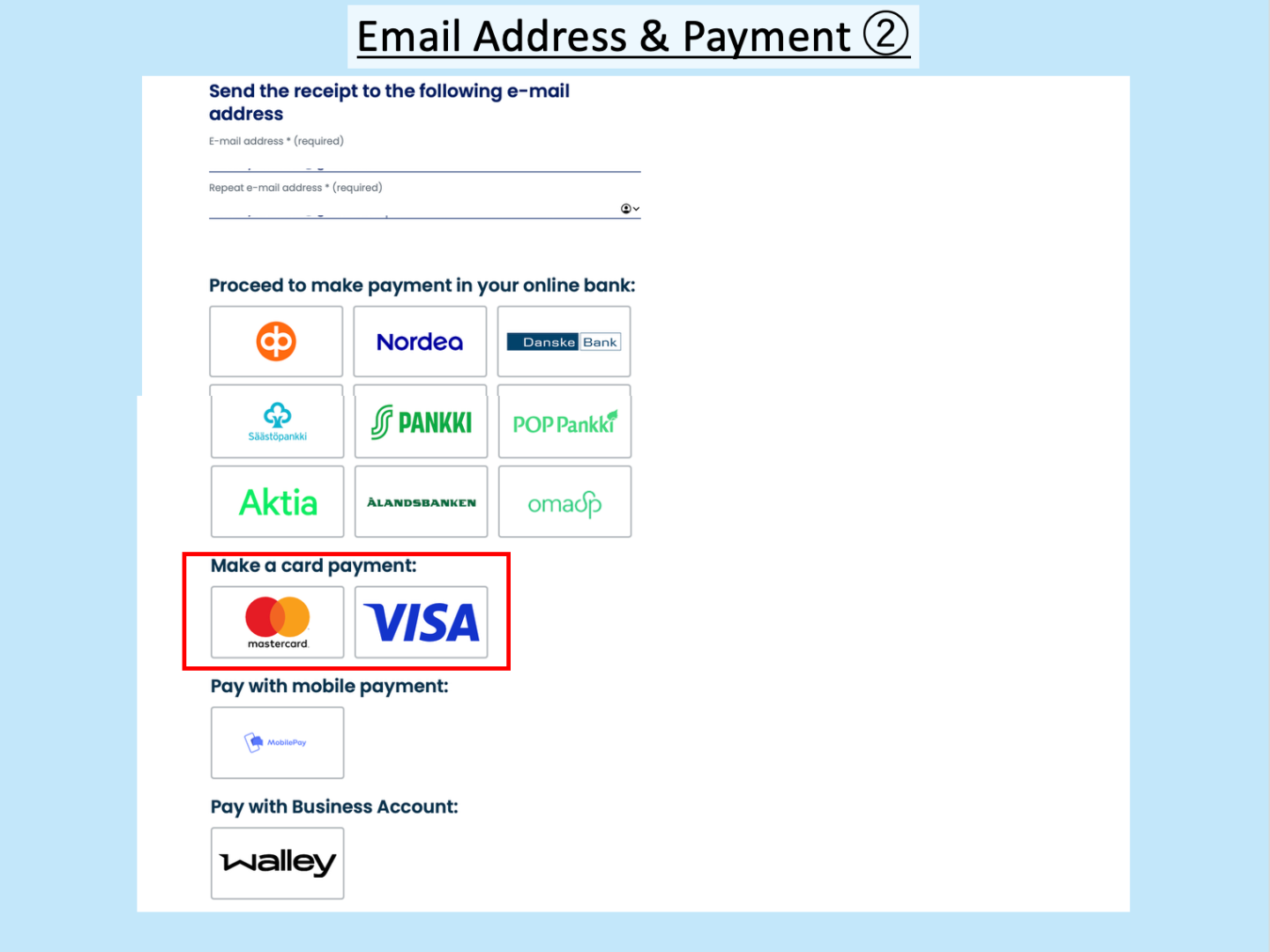 Scroll down further for payment methods. If you don’t have a Finnish bank account, payment will likely be via credit card. Select either Mastercard or Visa and click the logo.