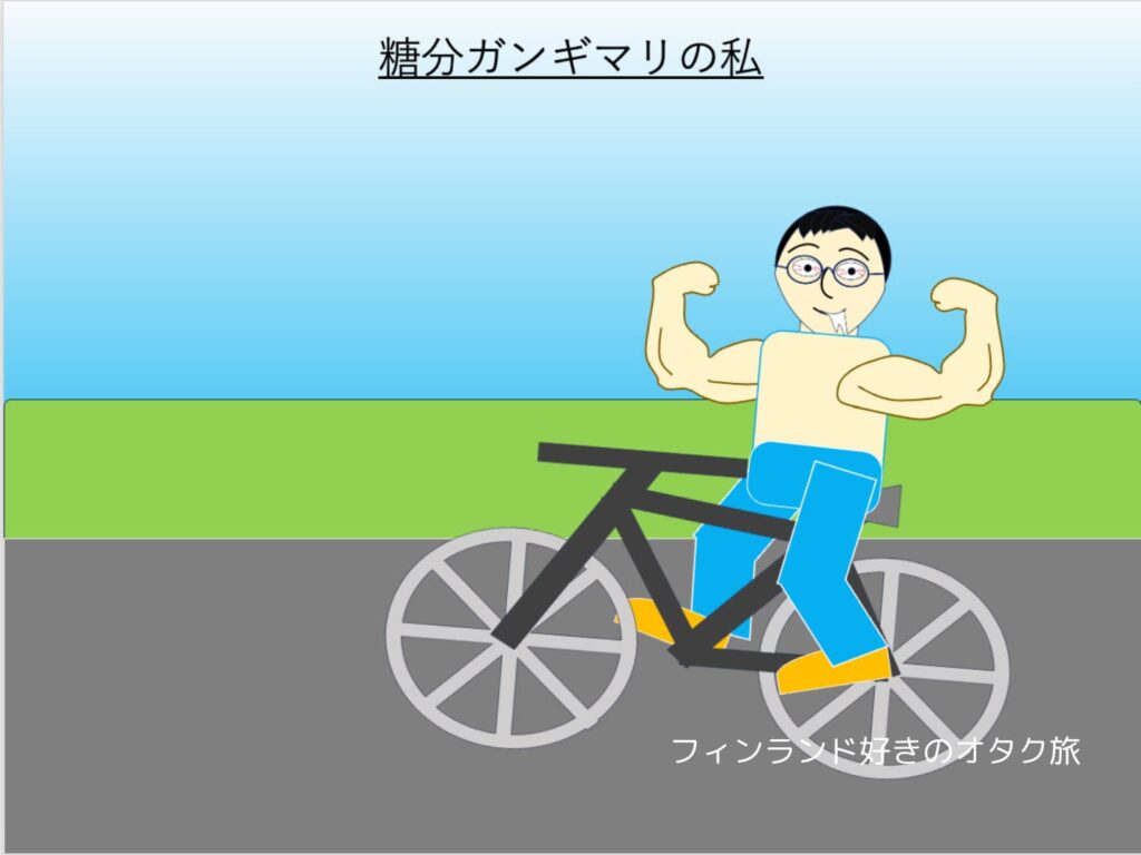 前の日から糖分源として食べていたのは、ライ麦パンだけです。噛んでも噛んでもあんまり甘くならない、あのパンです。糖分はあるのだろうけど、普通の食パンほどには糖分は感じられません。