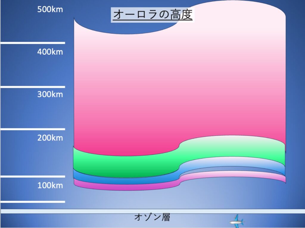 しかし、この答えは簡単で、オーロラが発生する高層大気では、酸素分子(O₂)は紫外線で分解され、酸素原子(O)として多く存在します。この酸素原子(O)は窒素分子(N₂)より軽いため、より高い高度に存在しているのです。オゾン層のでき方を学んだときに、この話を聞いたことがある気がします。