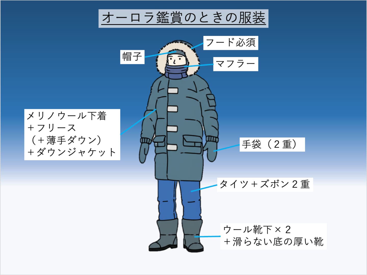 とにかく、オーロラを見に行って、「寒さでオーロラどころじゃなかった……」となるのが一番悲しいです。なので、見た目より機能を重視してください。