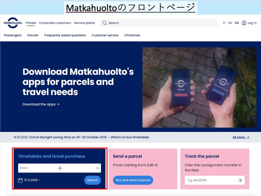 まずは、Matkahuolto公式サイトにアクセスしてください。