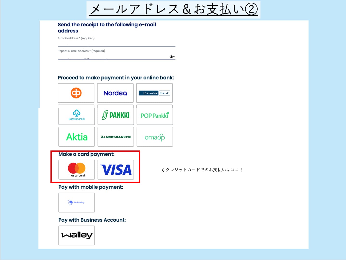 フィンランドの銀行口座を持っていない場合は、おそらくクレジットカードによる支払いがメインになると思います。MastercardかVisaを選んで、ロゴをクリックしてください。