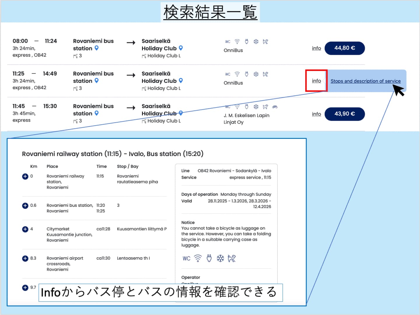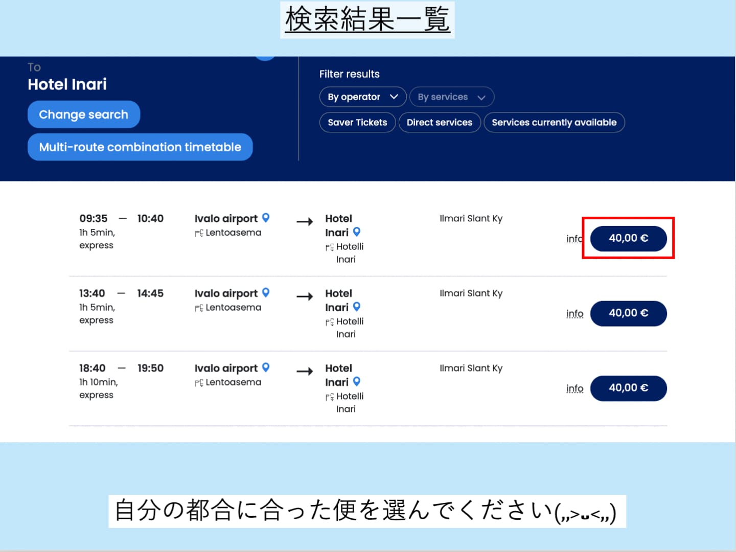 自分の都合に合った時間、バス会社(OnniBus/Eskelisen Lapin Linjatなど)、価格を選んで、価格のボタンをクリックします。