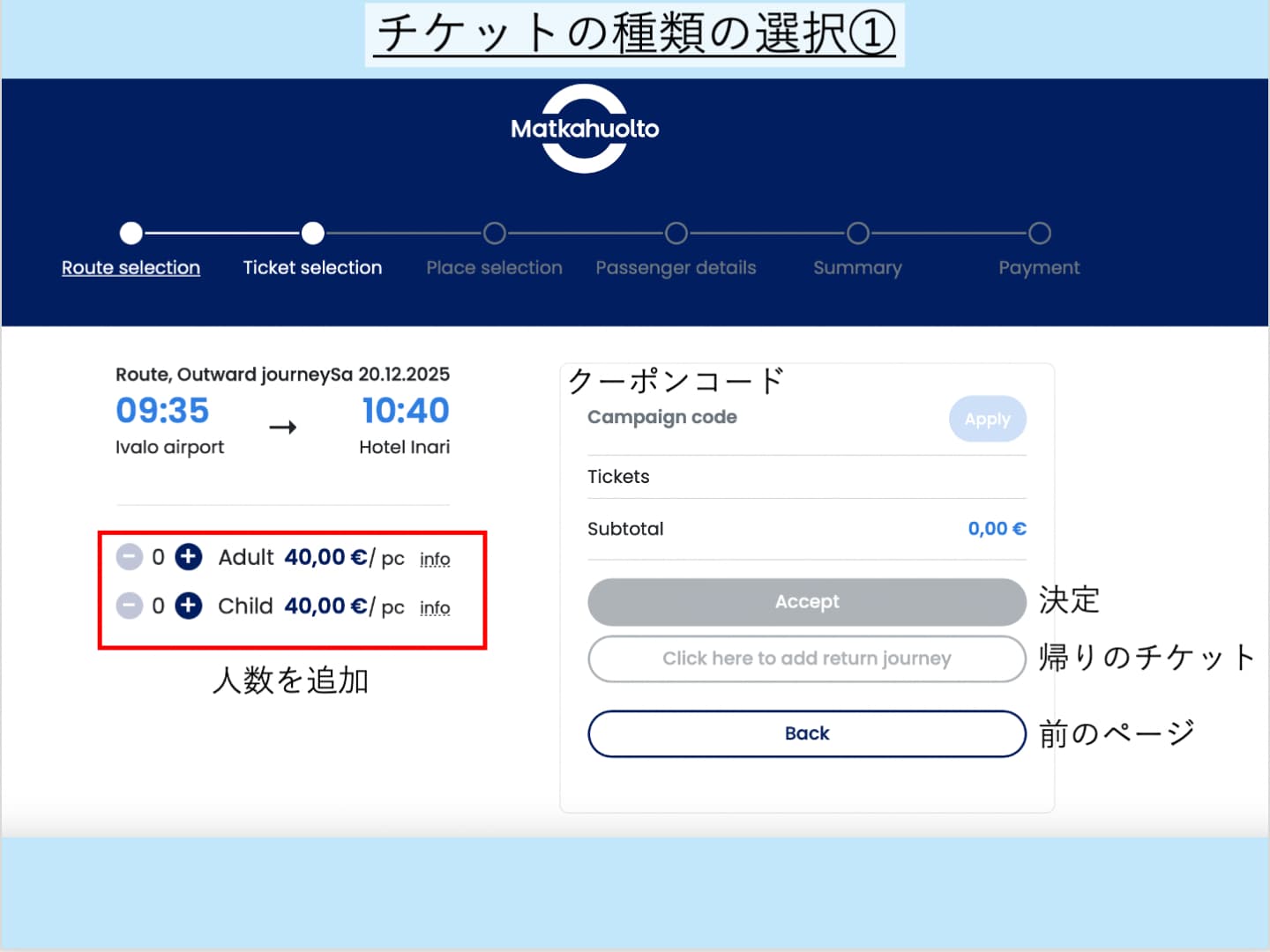 ステップ3:チケットの選択と乗客情報