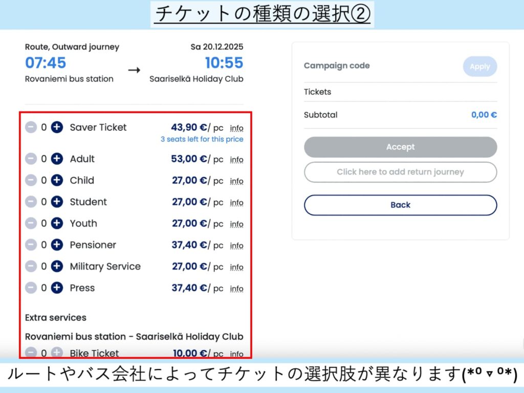 試しに、Rovaniemi bus station → Saariselkä Holiday Clubで検索してみたところ、チケットの種類がかなり多くなりました。このように、路線によって、チケットの価格が異なるので、計画段階で、色々選択肢を広げてみることをおすすめします。