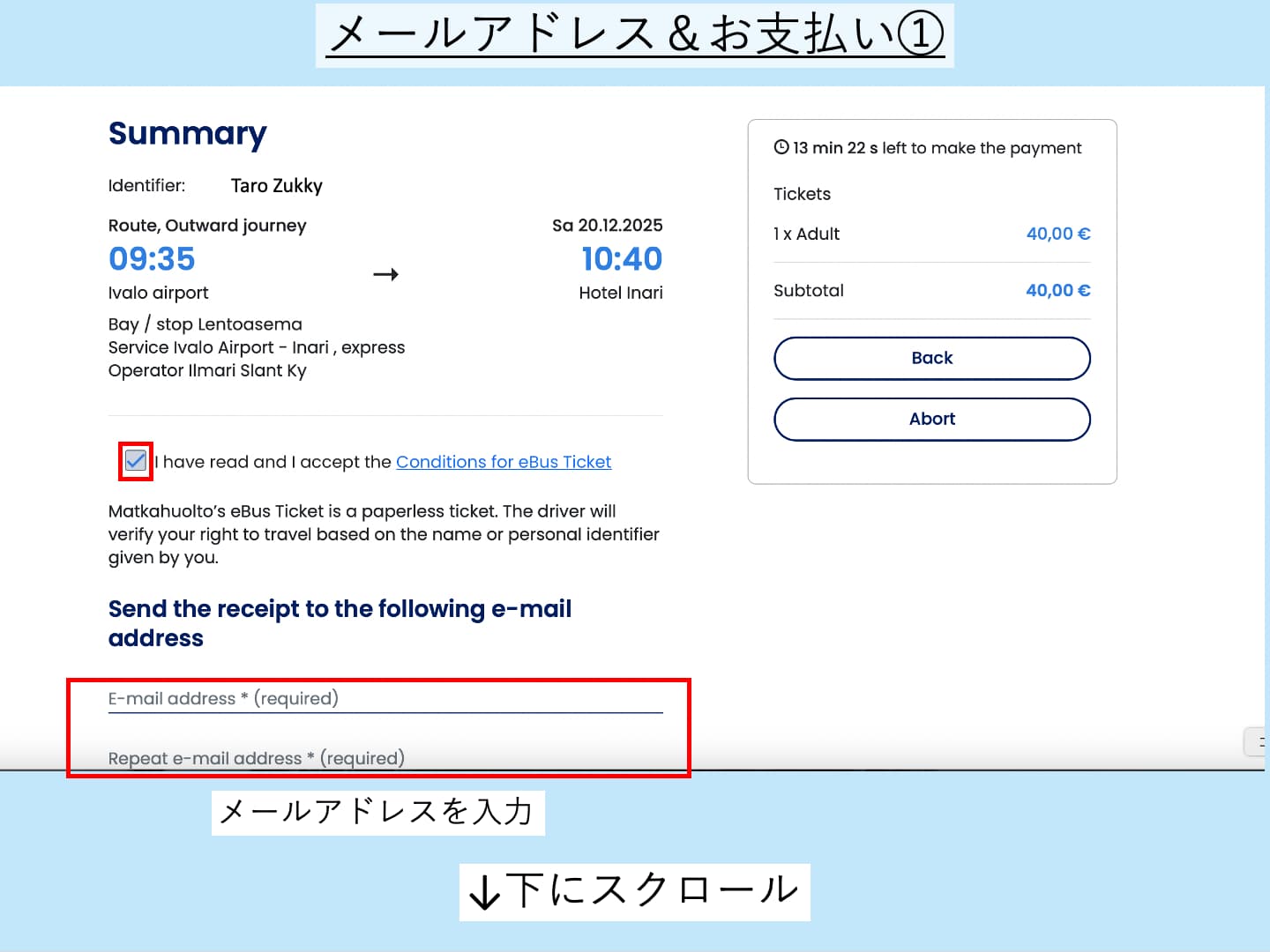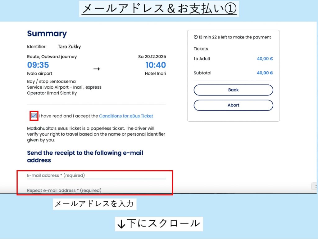まずは、eチケットの注意事項1を読んで、「I have read and I accept the conditions for eBus Ticket」にチェックを入れます。