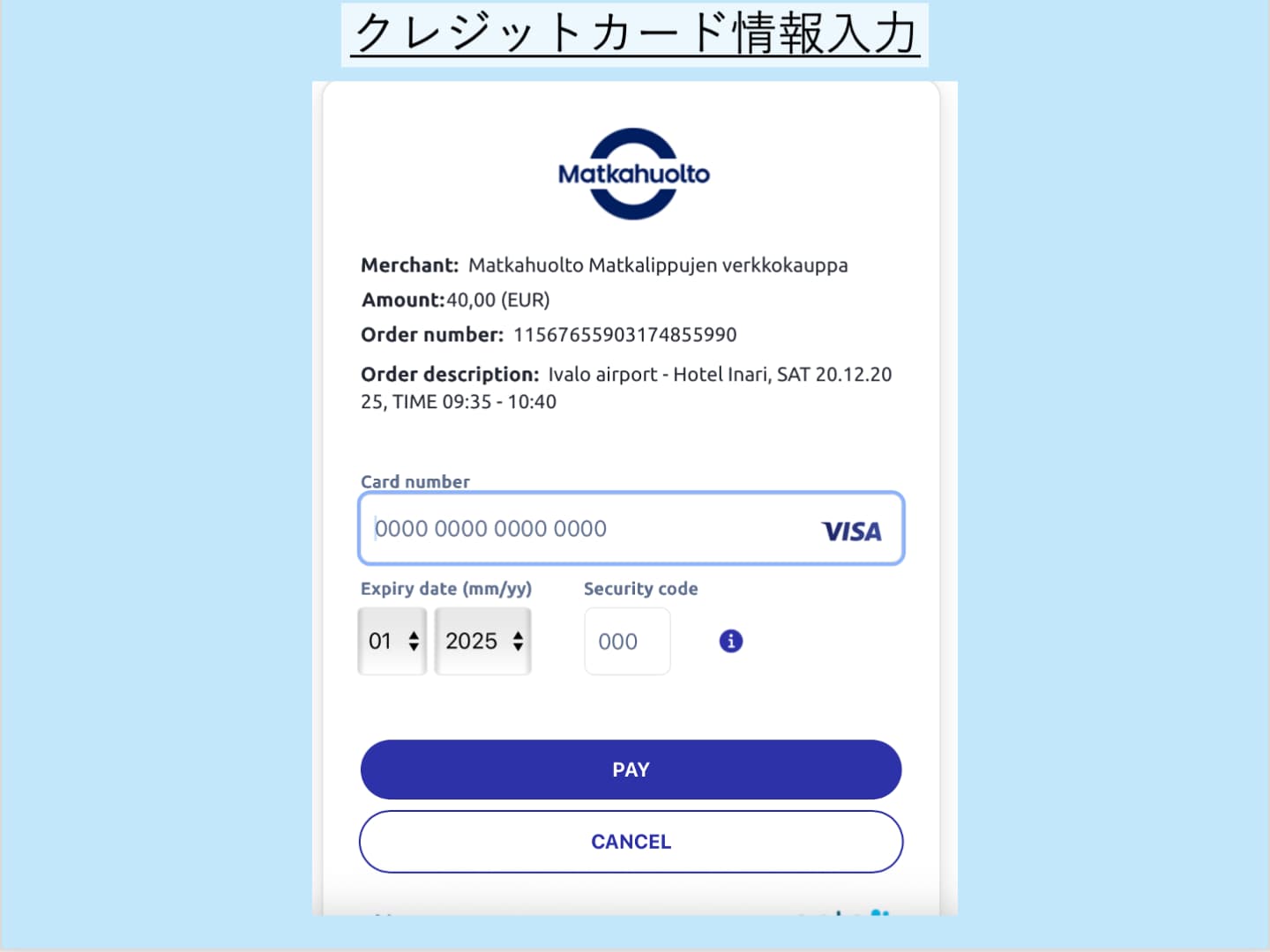 カード番号、有効期限、3桁のセキュリティコードを入力し、「PAY」を押します。