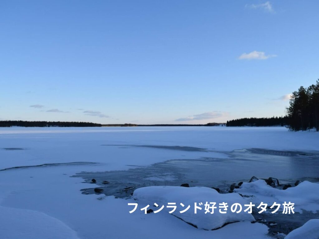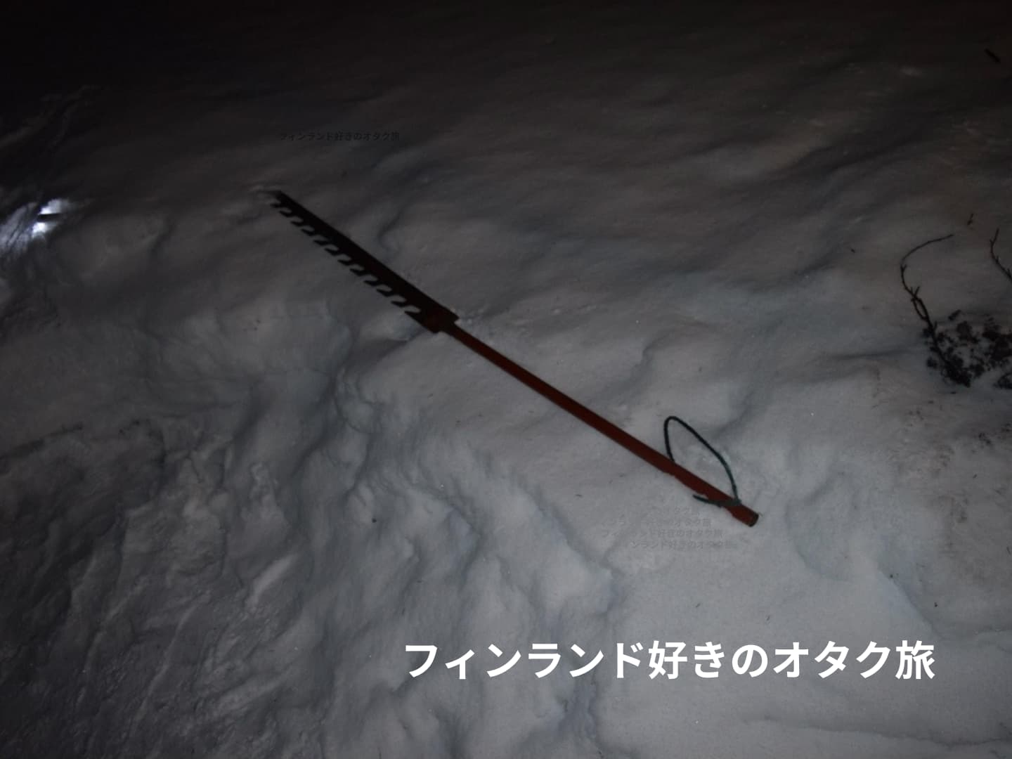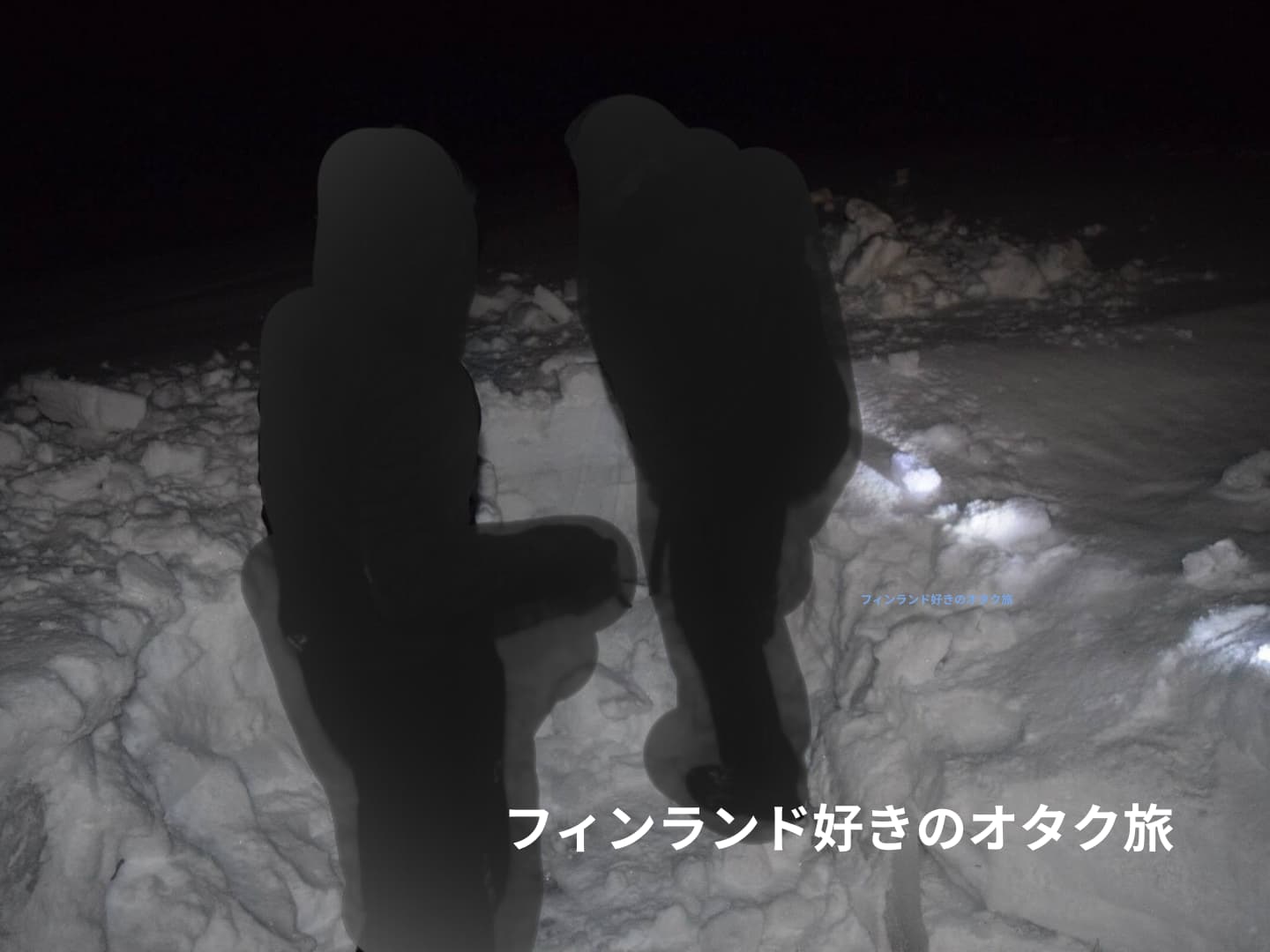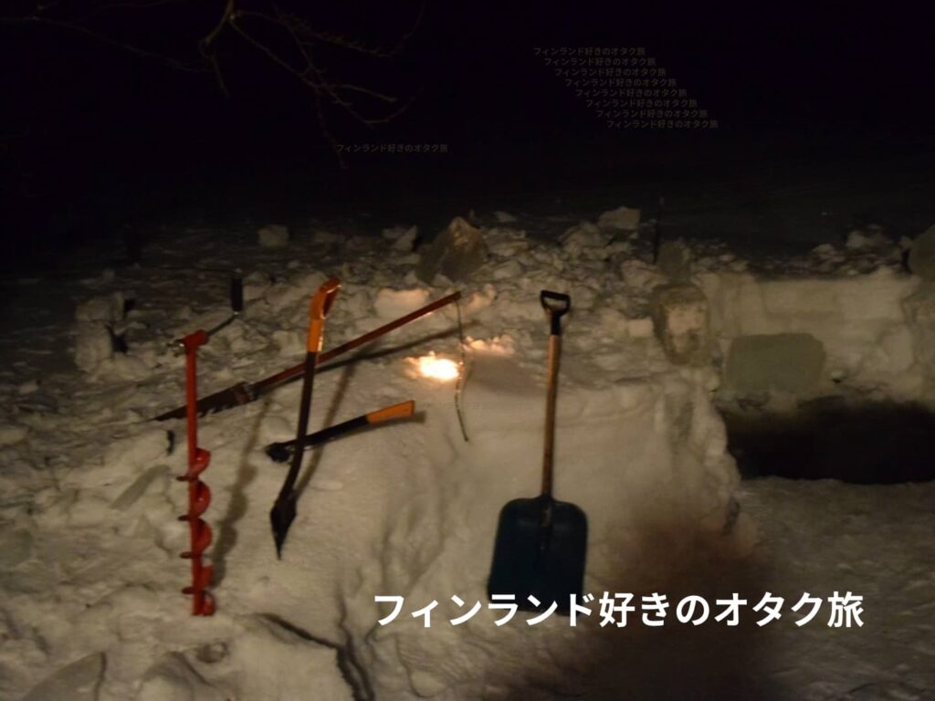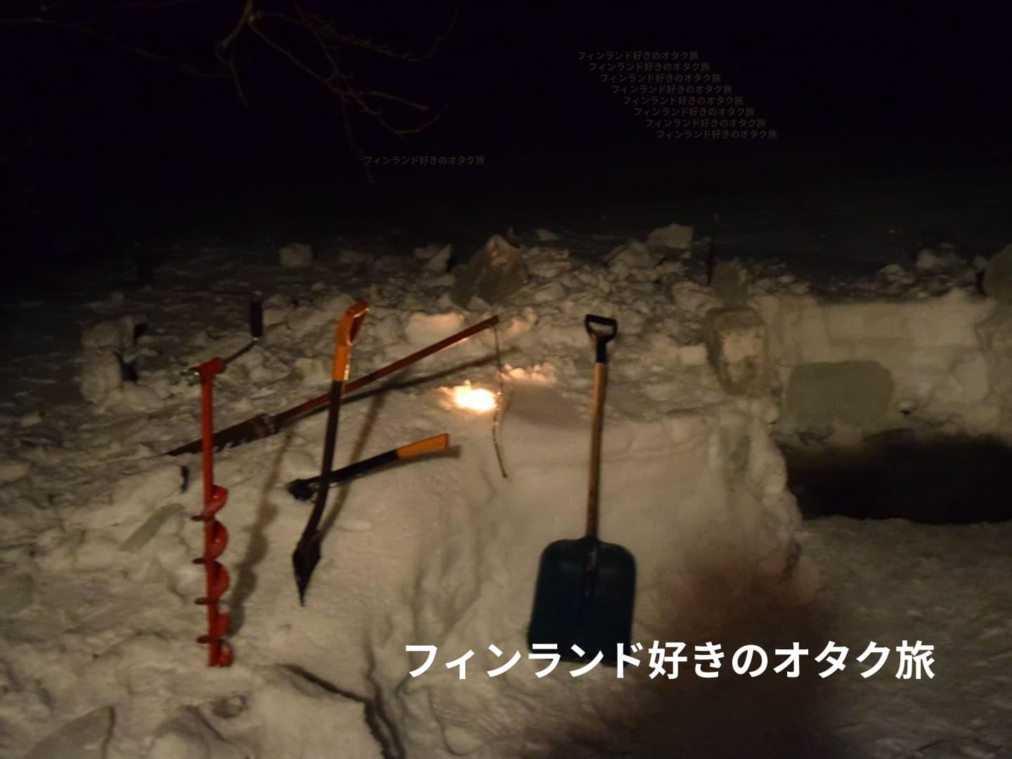 が、パッと見では、夜の闇と雪のせいで、どこからが湖かよくわかりません。その辺りは、慣れたフィンランド人の行動が早いです。雪をかいて、湖の表面に張った氷をすぐに掘り出しました。