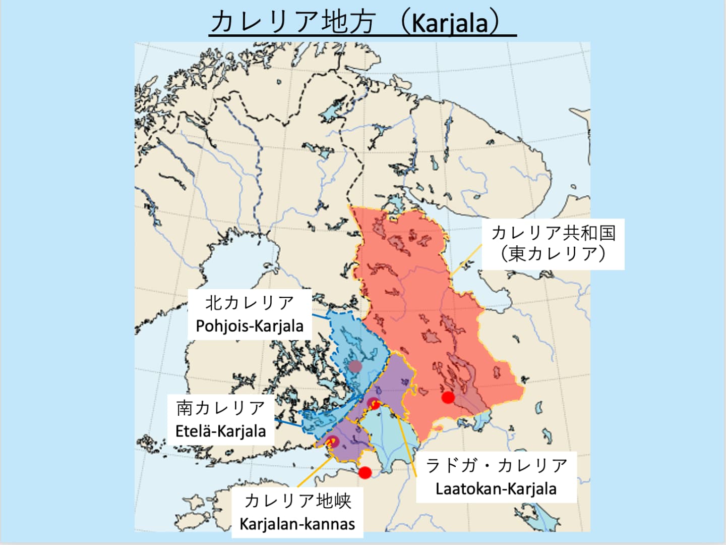 | フィンランド | 南カレリア | カレリア 地峡 | 北カレリア | ラドガ カレリア | 東カレリア | ||||