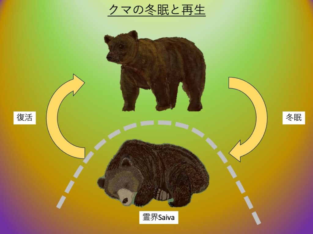 クマは、冬になると、穴に籠って冬眠し、春になると再び地上に現れます。このサイクルは、sáiva(霊界 ≒ 地下世界)からの再生や転生と結びつけられました。