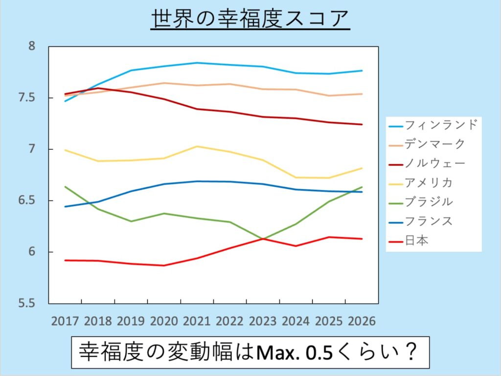 つまり、アンケートの数字は、現在の幸福ではなく、その国が伝統的に「自分たちの人生を何点をつける傾向があるか」という固定された物差しを表しているのではないか、という気がしてなりません。