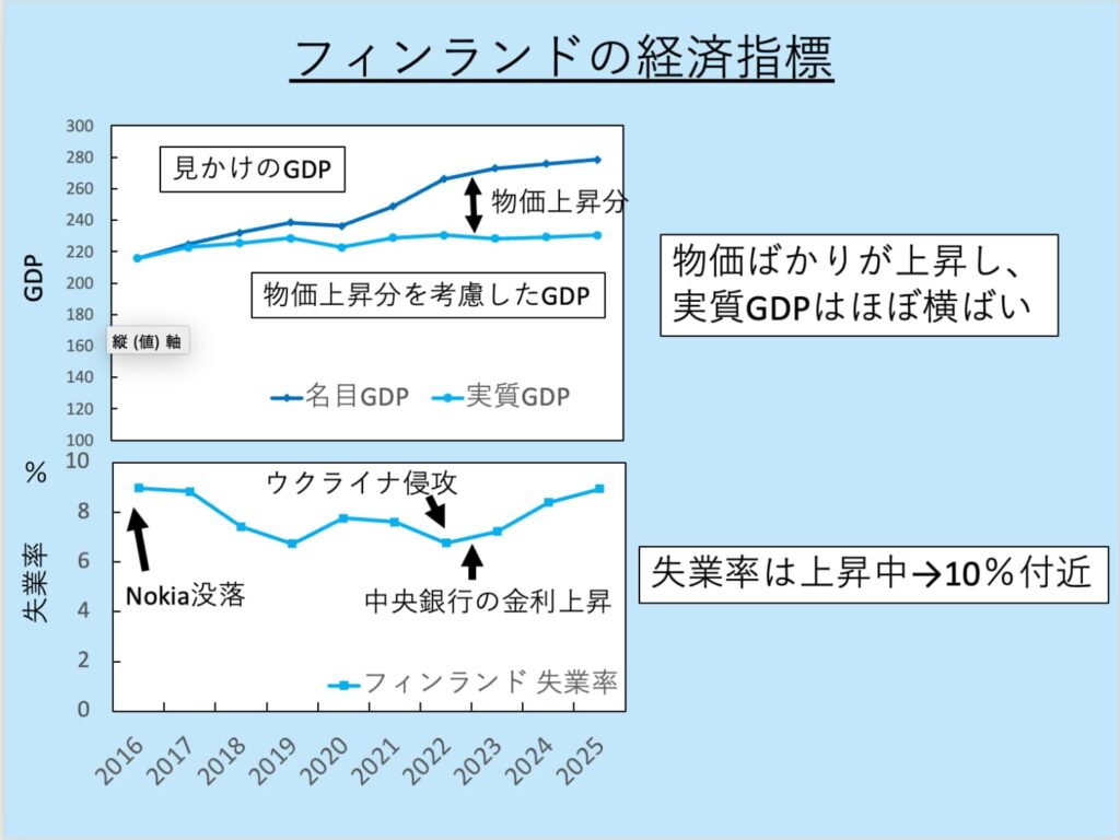 フィンランドの経済を見てみると、物価上昇が起きている上、実質GDPは横ばいです。つまり、物価上昇分を引くと経済が成長していない状態です。失業率も10%付近をうろちょろ。