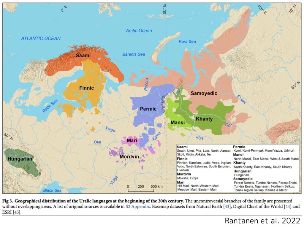 Rantanen, T., Tolvanen, H., Roose, M., Ylikoski, J., & Vesakoski, O. (2022). Best practices for spatial language data harmonization, sharing and map creation—A case study of Uralic. Plos one, 17(6), e0269648. 20世紀初期のウラル語族の地理分布(Rantanen et al. 2022 Fig.3より)