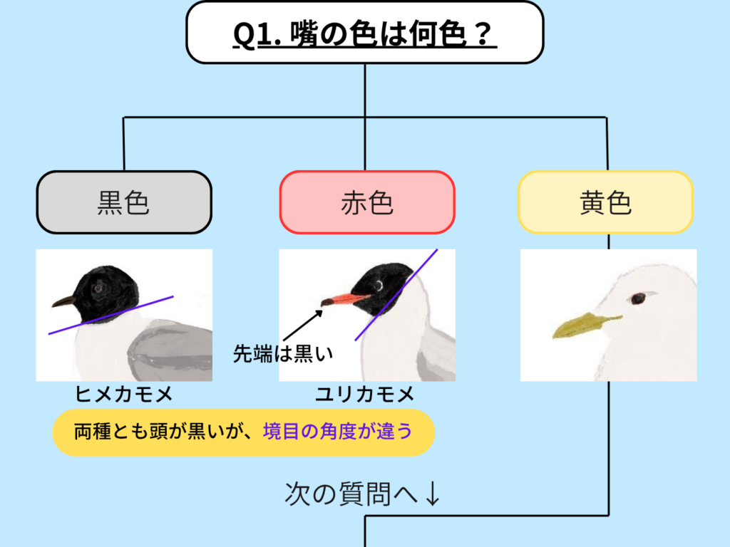 嘴の色で、ヒメカモメ(黒)とユリカモメ(赤と黒)は特定できます。残りの4種は黄色い嘴をしています。