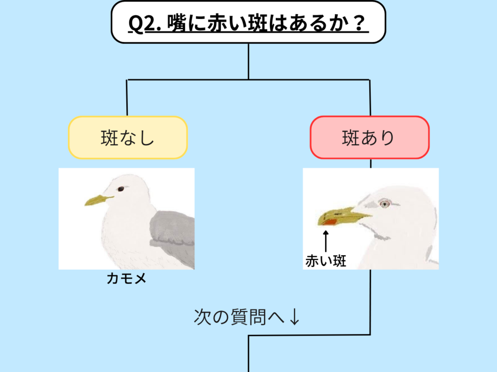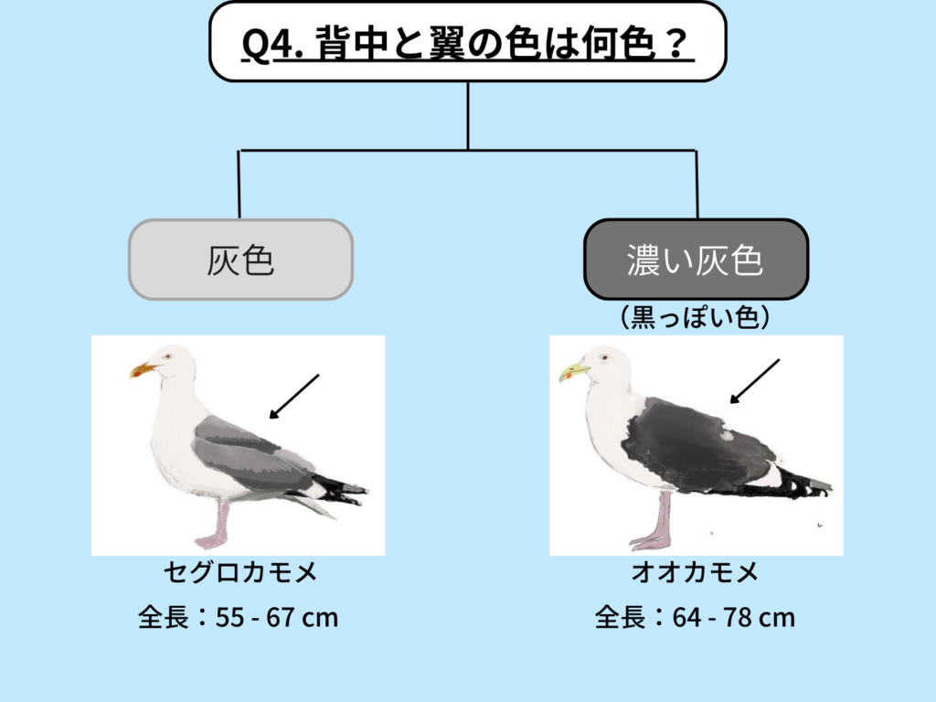 嘴の色→足の色→背中(翼)の色の順番なら、初めての方でも見分けられると思います。難しいのは最後だけで、セグロカモメとオオカモメは、大きさと灰色の濃さが違いますが、初めてだとわからないかもしれません。