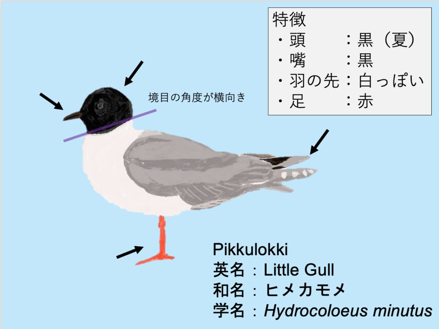 | 名称 | 芬名:Pikkulokki 英名:Little Gull 和名:ヒメカモメ 学名:Hydrocoloeus minutus |