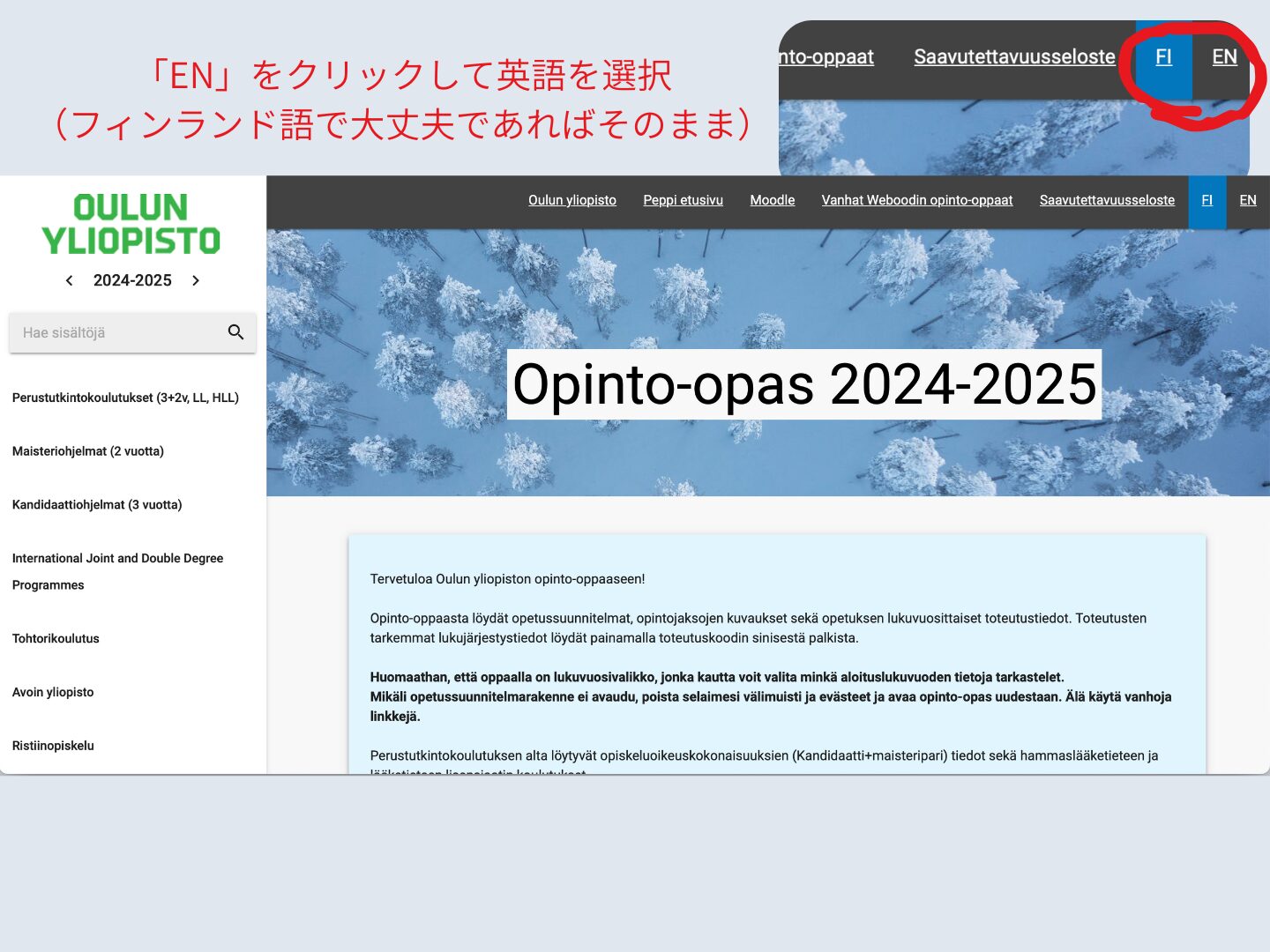 たぶん大丈夫だとは思いますが、念のため、左上の緑文字OULUN YLIOPISTO (University of Oulu)の下の授業年度が最新になっているかを確かめましょう。