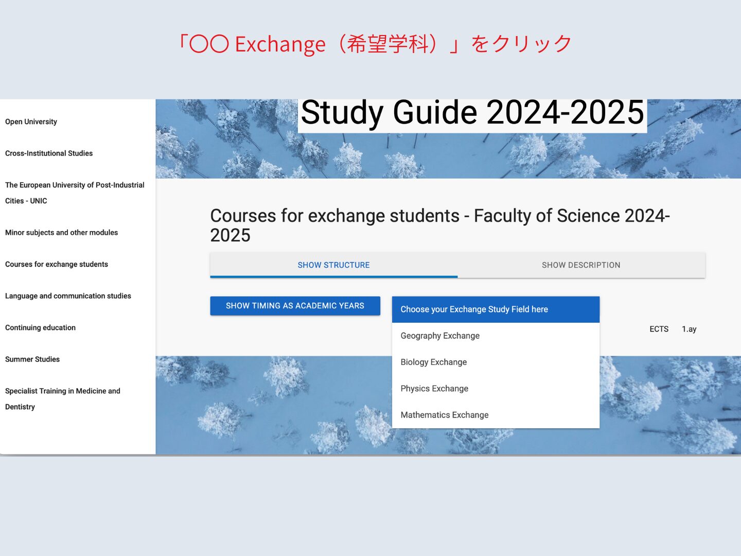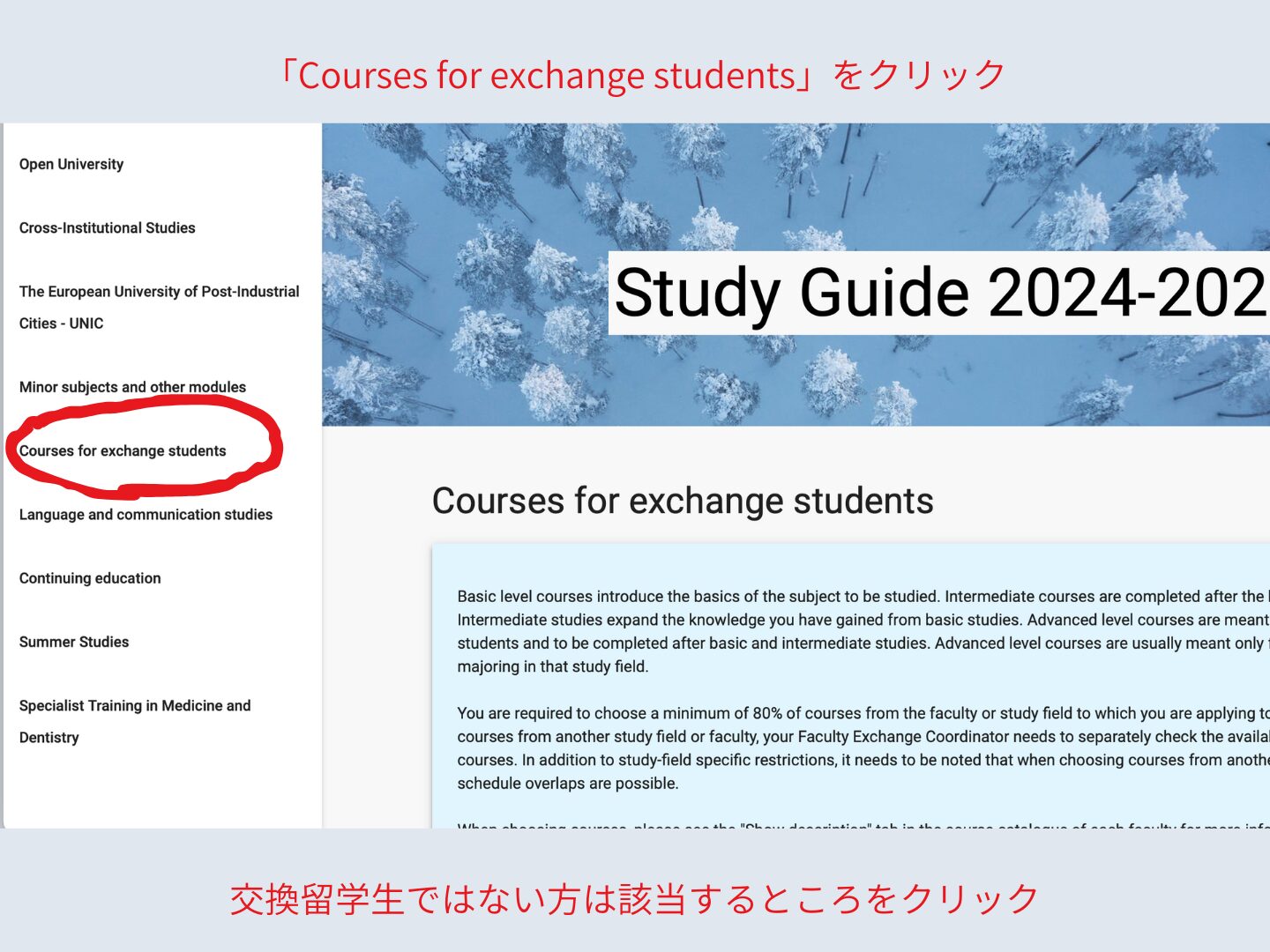 左の白い欄から、”Courses for exchange students”を見つけて、クリック。
