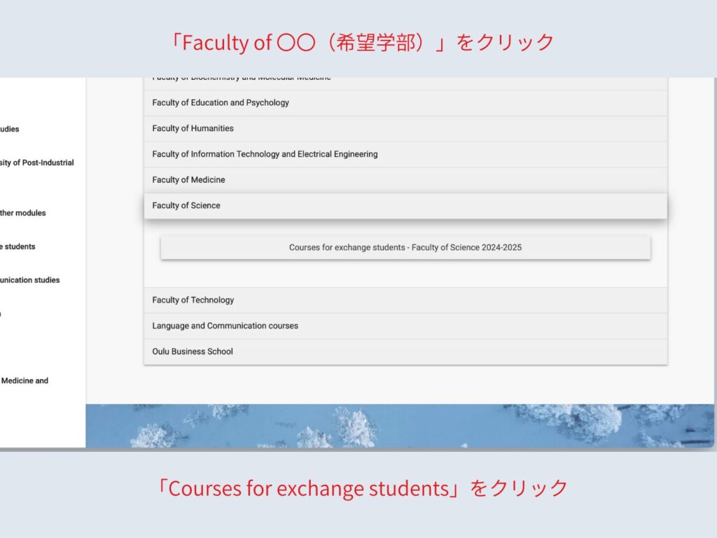 「Faculty of 〇〇」と学部の一覧が出てきたので、下にスクロールして、その中から希望の学部を探します。自分の分野の「Faculty of 〇〇」をクリック。表示された枠の中に表示された文字「Courses for exchange students – Faculty of 〇〇 2024-2025」をさらにクリック。