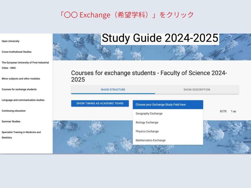 希望学部のページが表示されたので、”Choose your Exchange Study Field here”から希望する学科を選択します。