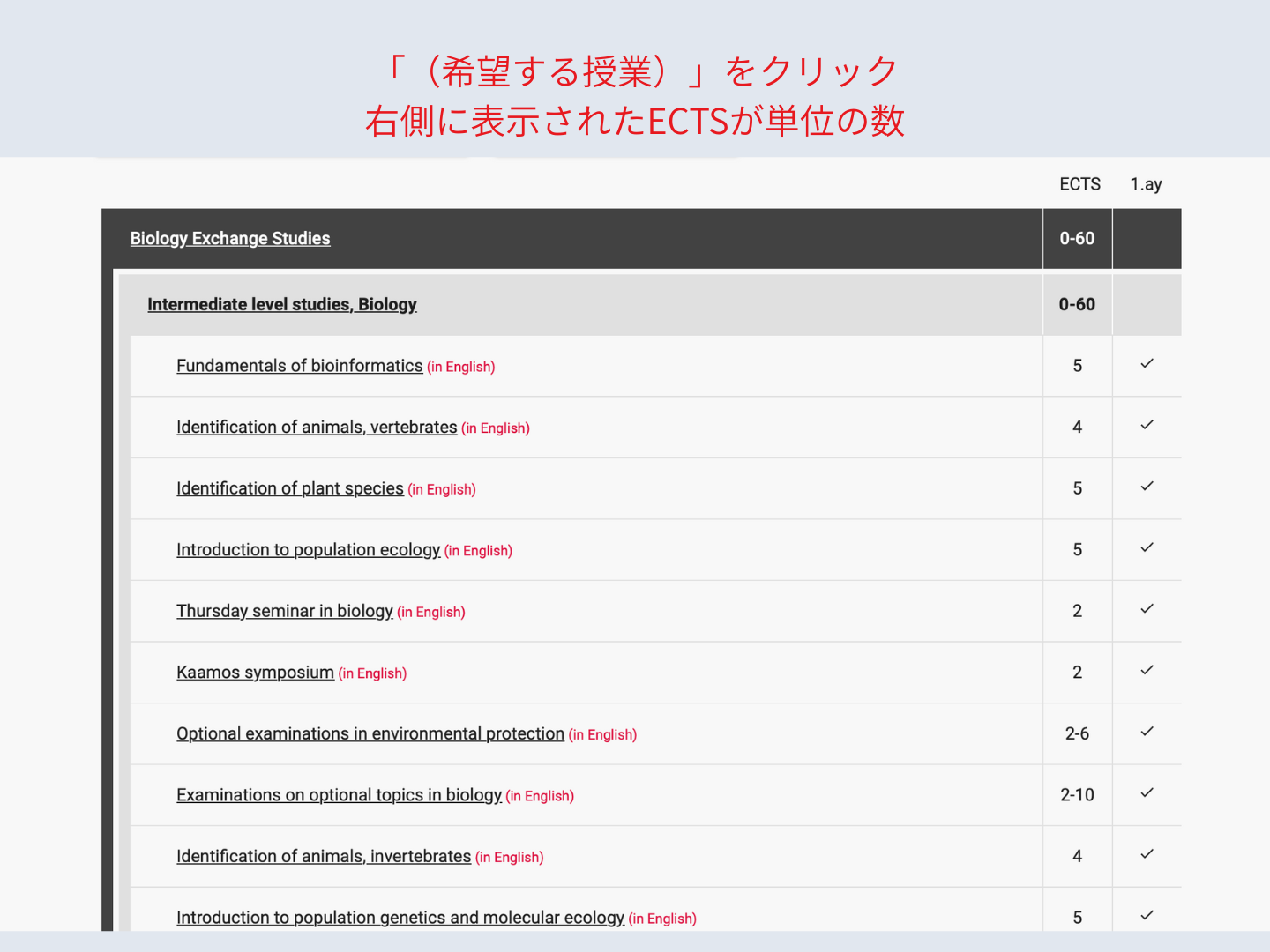 授業一覧が表示されるので、興味のある授業をクリックすると、授業内容を知ることができます。右側に表示されているECTSが単位(credits)に当たります。日本の大学との単位の変換要件は大学により異なりますので、自分の大学に問い合わせてください。