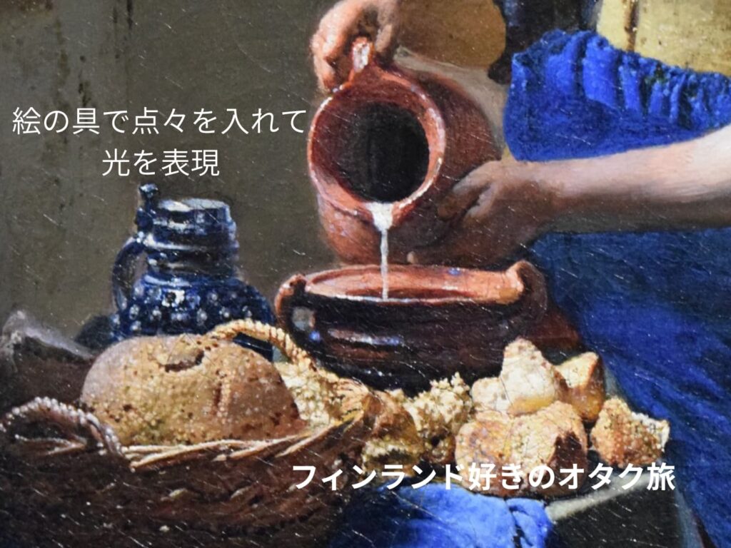 フェルメールの絵は、光の輝きや立体性を表現するのに、点々をたくさん使っているところが特徴です。それが実物だとよく見えます。絵の具の小さな丸い粒々の一つ一つまで見えるんです。しかも、画材がいいので、立体的に輝いて見えます。