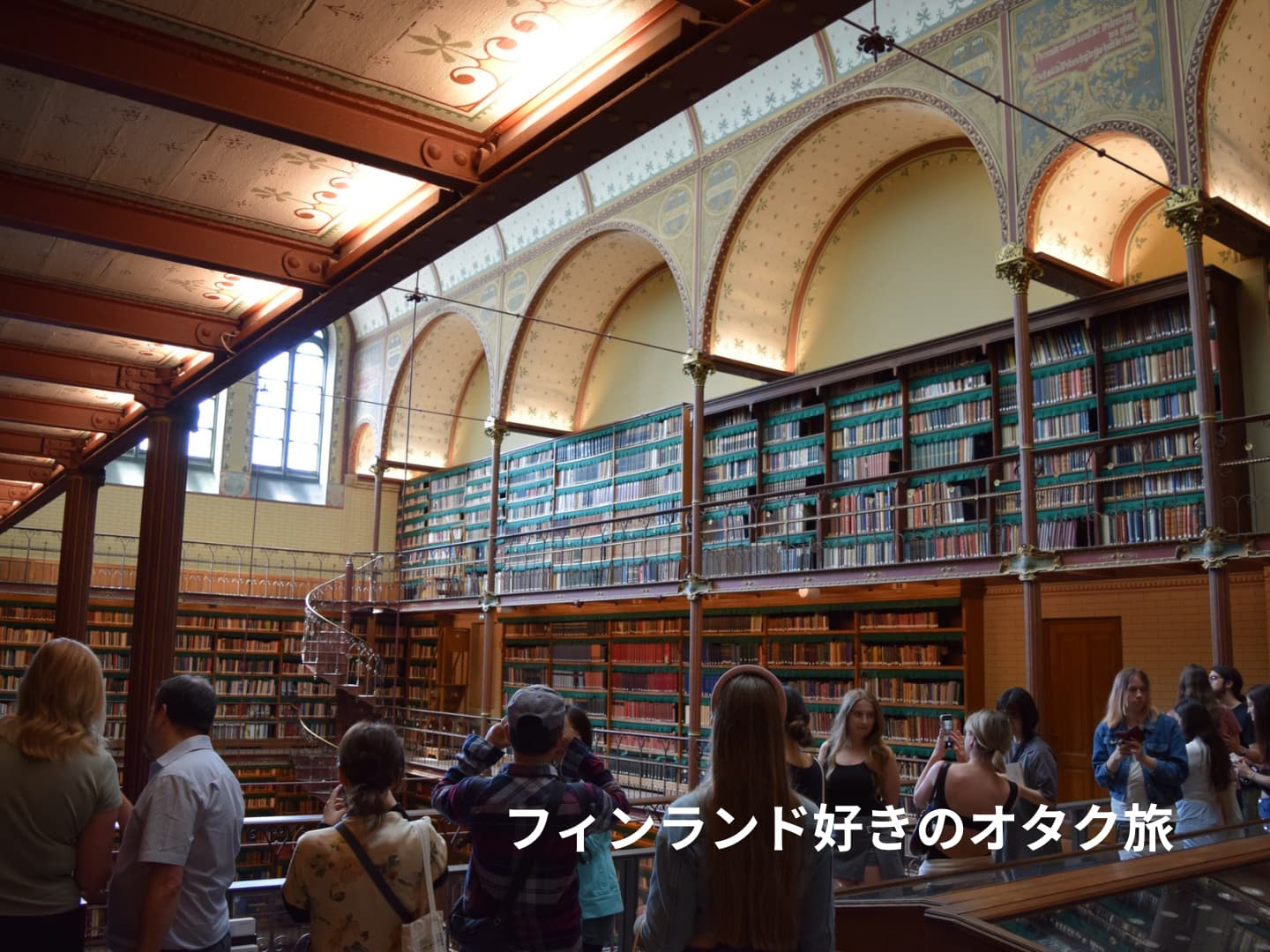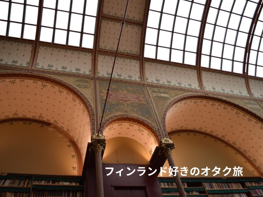 見るべきは装飾の美しさと螺旋階段、アーチ構造。光をたっぷり取り入れる天窓。壁に並び立つ本棚。華やかな近代ヨーロッパの暮らしに迷い込んでしまったような景観ですが、過去の図書館ではなく、今も生きているかのような手触りです。ふと階下を見下ろすと、真剣に本を読む人々がいます。