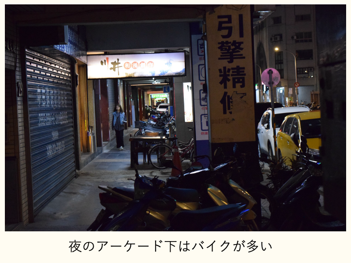台北の街はアーケードが張り出していて、雨に当たらないので素敵だなという印象ですが、夜は少しだけ雑然としています。昼間に比べて、バイクがたくさん停まっているからだと思います。