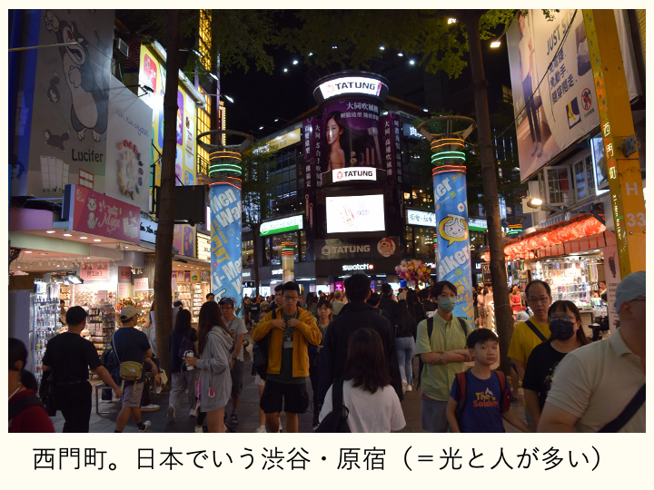 中正紀念堂站からMRT松山新店線(ー緑の路線)に乗って、2駅移動し、西門站へ。電車を降りた時点で察していましたが、駅を出ると、溢れ出しそうなほどの人の群れ。私の人酔いゲージがガンガン上がってきているのを感じます。光もピカピカで、目がチカチカしてしまいます。