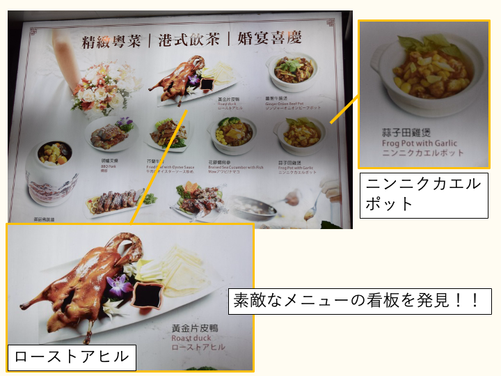 独自の表現を使っていますね。ローストアヒルやニンニクカエルポットなど、食材と調理方法が直接伝わる料理名にしているようです。選ぶときに「これなんだろう?」とか難しいことを考えずに済むように配慮してくれているのかもしれません。素晴らしいと思います。