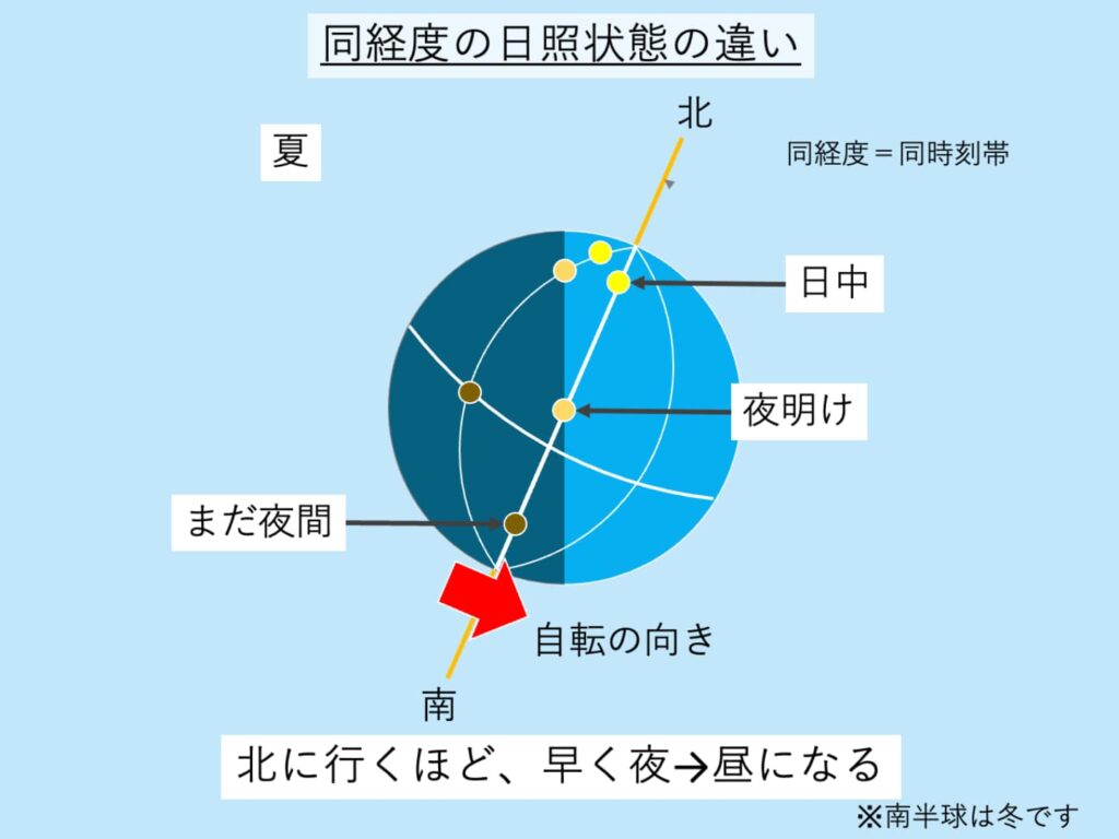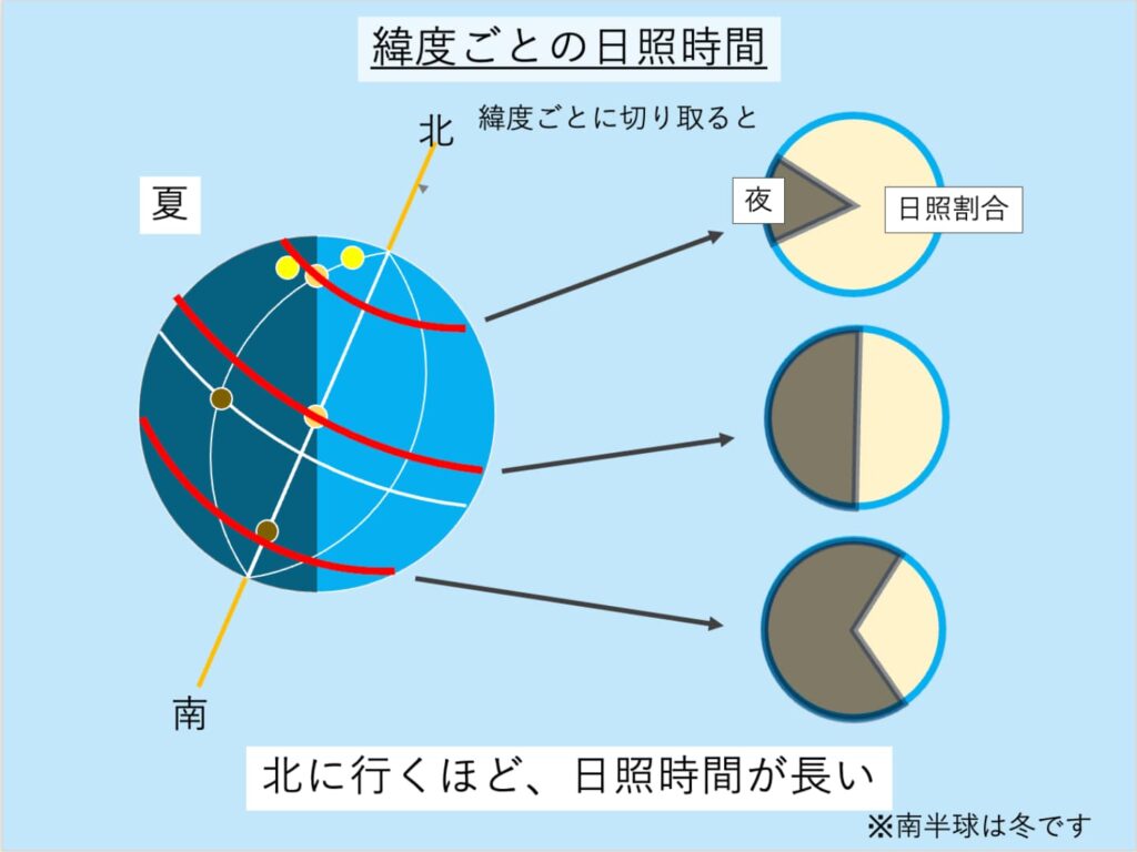 - 夏の日の長さは、緯度が高くなるほど長くなる(冬は逆に短くなる)