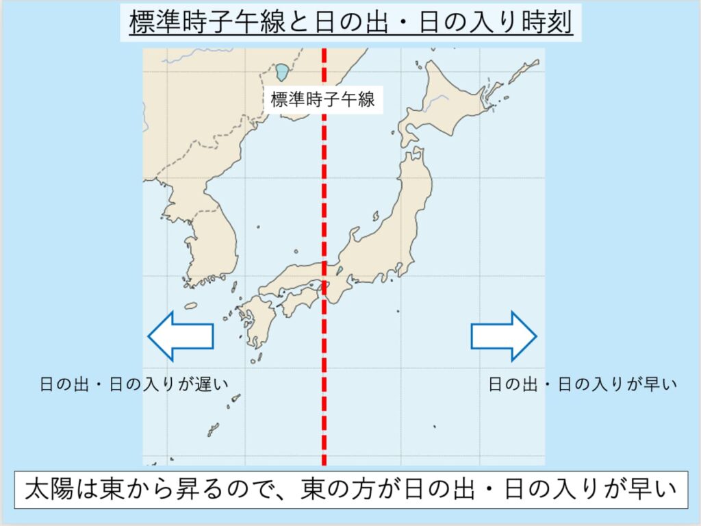 実際には、同じ標準時子午線を基準にする地域内(同じ時刻帯)では、東に行くほど、日の出・日の入りの時刻が早くなります。