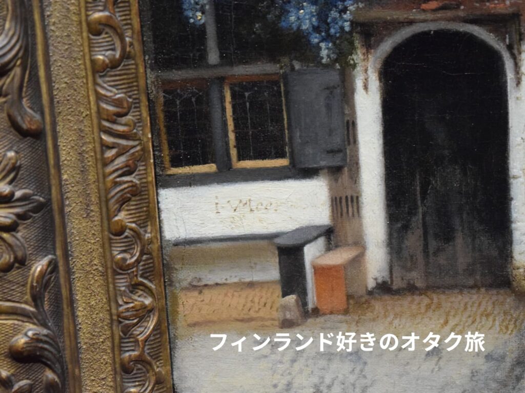 この絵には、フェルメールのサインが入っています。サインにはいくつか種類があるようですが、「i-VMeer」と書かれているように見えます。フェルメールの本名は、Jan van der Meer van Delftなので、Meerという文字が書かれていることが多いようです。