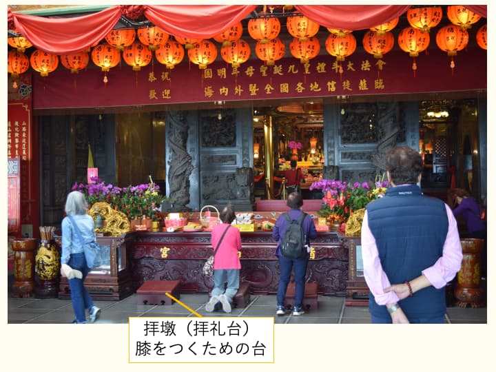 拝墩(拝礼台)に跪いて、12回頭を下げてお辞儀します。おそらく「お願いします」の意味だと思います。人が多いときなどは3回でも大丈夫だそうです。お辞儀の仕方は、まず手を合わせ、頭を下げながら手を台の上に下ろします。台の上に手を下ろす際は、男性は手のひらを下にして、女性は手のひらを上にするのだそうです。 - 〈簡略ver.〉