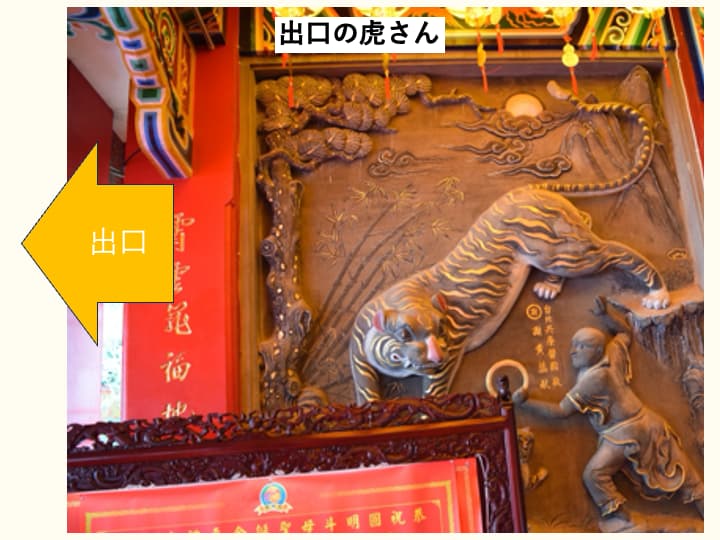 寺廟には、向かって正面右側の入口から入って、左側の出口から出るという風習があります(神様から見ると、左から入って右から出る)[3], [4], [5], [6]。「龍進虎出」といい、入口側には龍の絵や彫刻(龍辺)が置かれ、出口側には虎の絵や彫刻(虎辺)が置かれているので、それを目印にしてください。