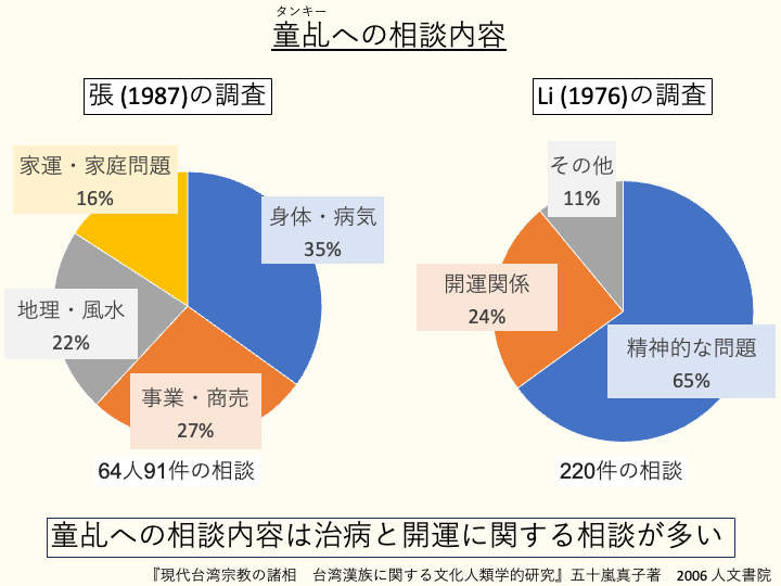 童乩・尫姨・扶鸞といった霊媒の中で、実際に童乩がどのような相談を受けているのかについて、五十嵐(2006)がまとめています[2]。