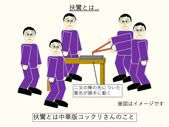 | 特徴 | 神様が筆や手に憑いて、文字を書いて神託を伝える。 中国版コックリさん |