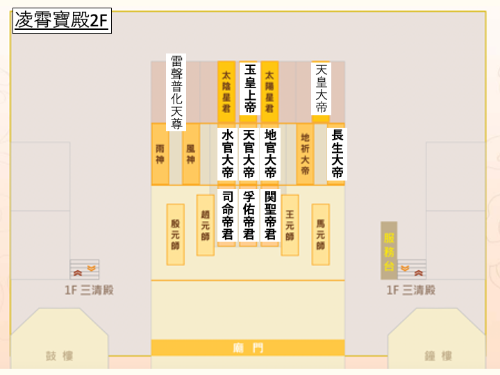 天皇上帝は天皇の名前の由来になったとかなんとか言われる神様です。あくまで一説です。雷聲普化天尊は雷の神様です。中国人は農耕民族なので、その生活は天気の影響をモロに受けてしまいます。天気系の神様が非常に強い信仰の対象となりました。そのため、この雷の神様はかなり位が高い神様とされています。