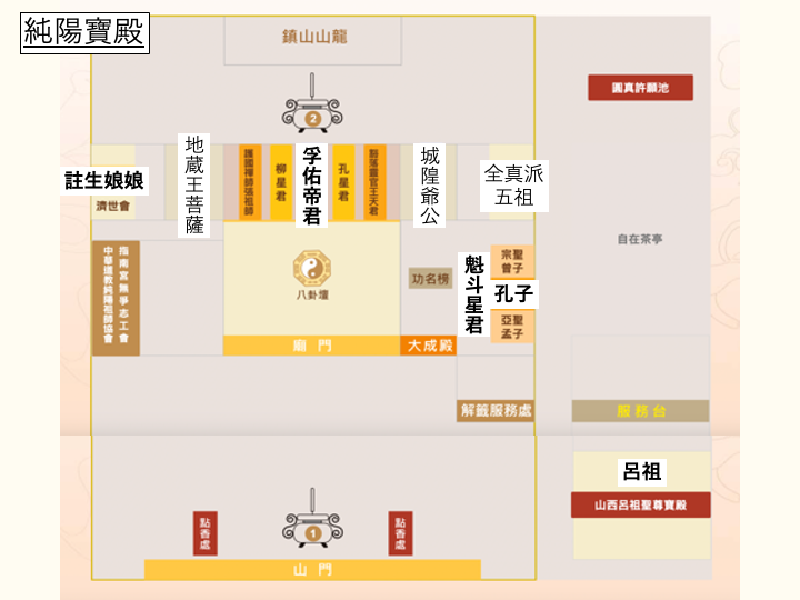 太陽を見て方位がわかる人なら上の地図でいいのですが、私のような地理感覚があまりない人間には、下の地図の方が直感的にわかりやすいです。上の地図だと、パッと見では、純陽寶殿じゅんようほうでんの階段を降りた先に大雄寶殿だいゆうほうでんがあるようにも見えますが、実際は純陽寶殿の裏側(横側?)に大雄寶殿があります。