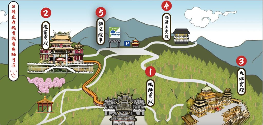 公式HP[1]には地図が2種類載っています。「ホーム画面>参訪引導>全覽地圖」で見れる地図(上)とホーム画面の下の方にスクロールした先にある地図(下)があります。上の地図は「北を上にした地図」で、下の地図は「山の山頂を上にした地図」です。